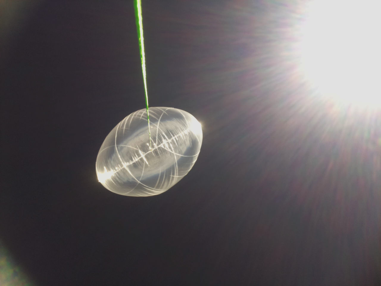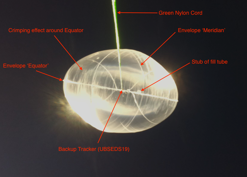 The UBSEDS20 balloon was built from 50 micron thick PA-EVOH-PE multilayer film and was 1.9 meters in diameter. This is 0.4m more than the usual 1.5m diameter. The larger size meant the longest axis of the balloon and payload combined was more than 2 meters, and so a NOTAM was required and obtained for the launch.
