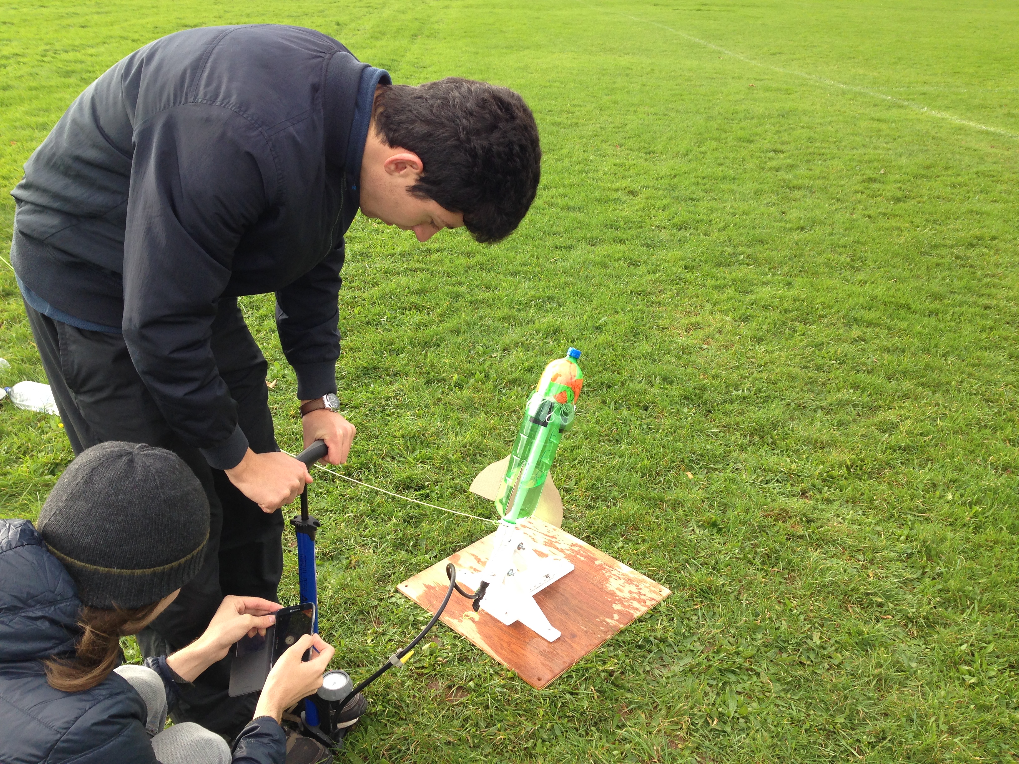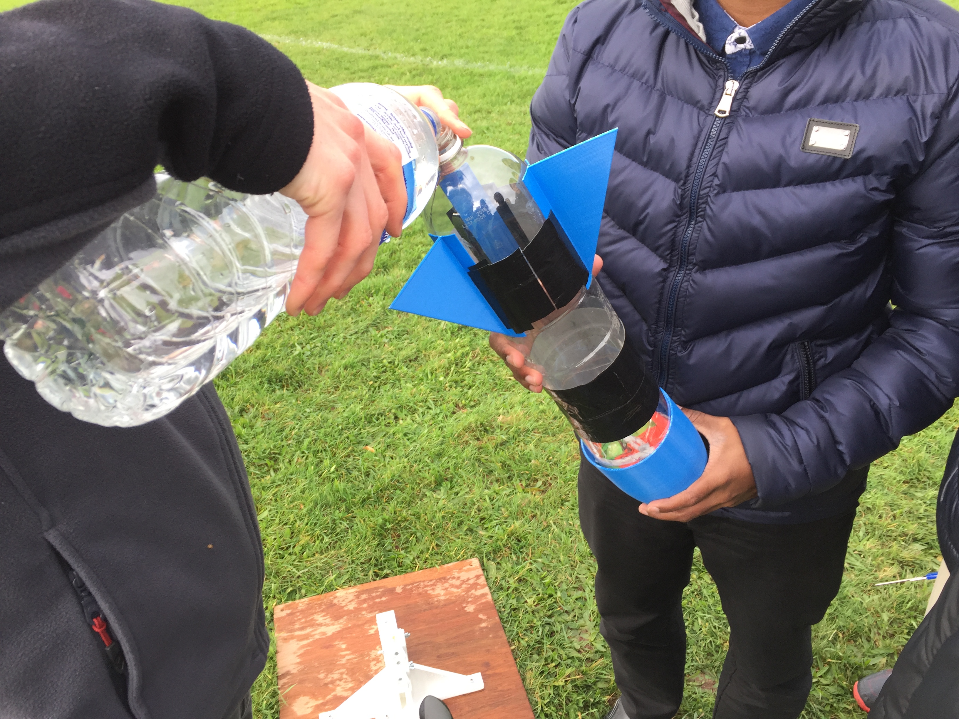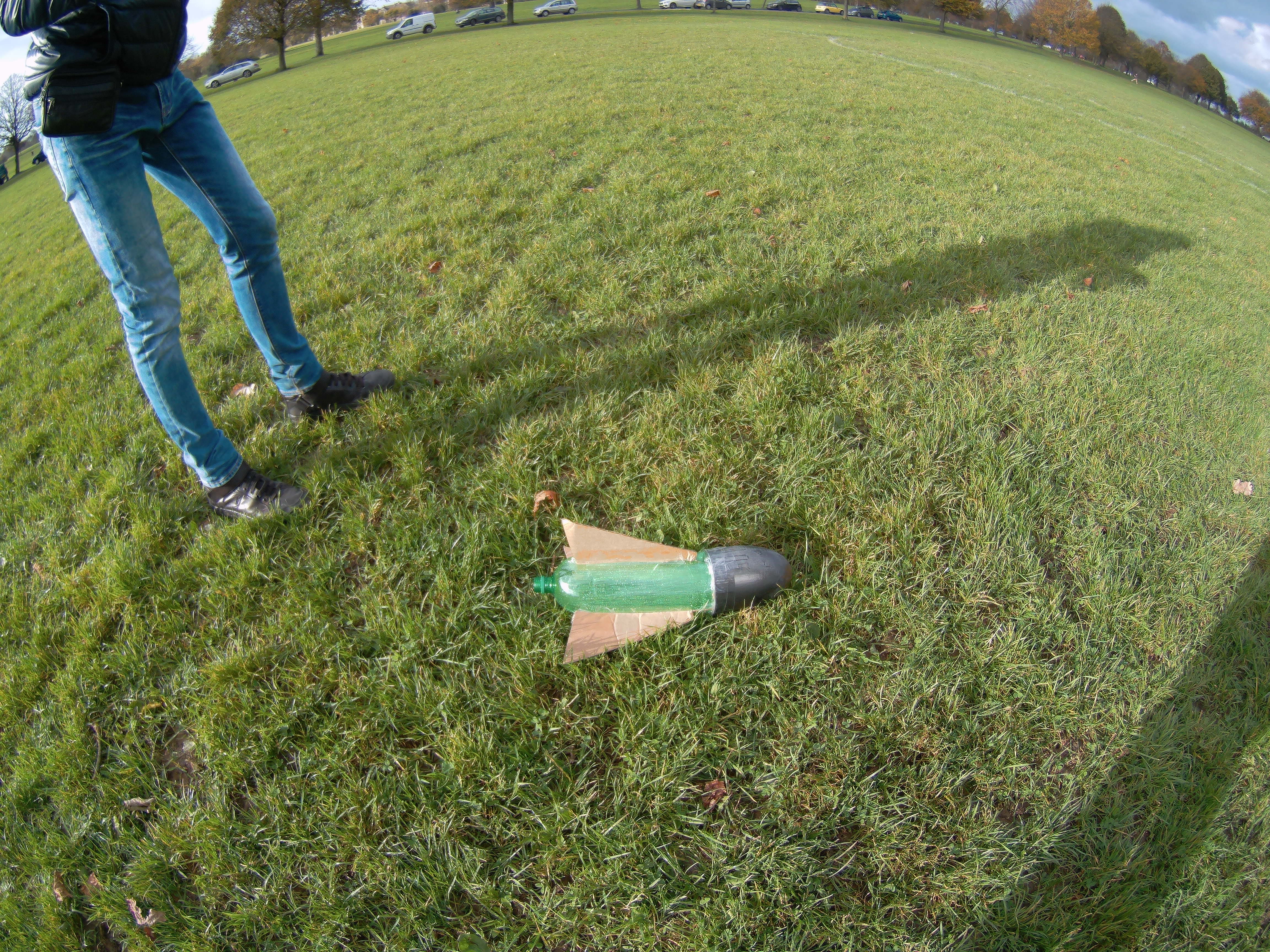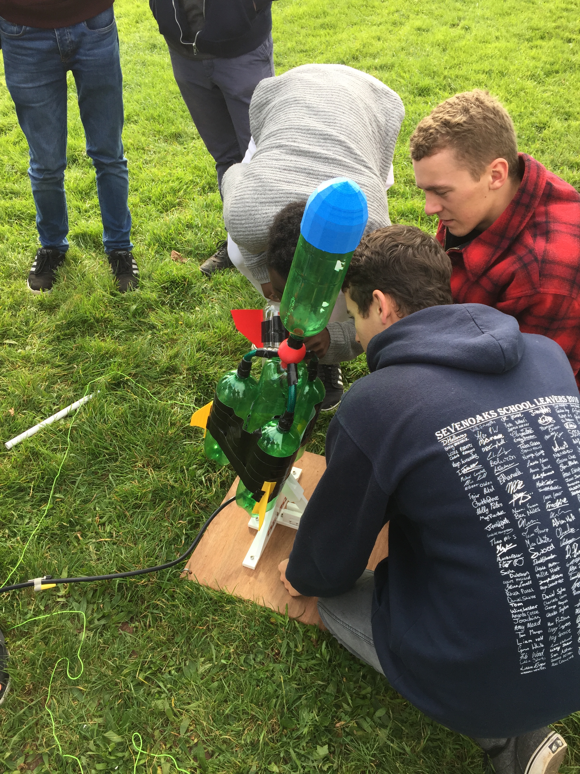 Our competitors were given four weeks to build their rockets from the kick off meeting to final launch day, with a test launch day a week before the end of the competition. In the intervening time the teams had to select their pressure vessel (2L lemonade bottle), choose their stabilisation fins (cardboard triangles), and design a nose cone (cardboard cone taped to the bottle). Teams showed an enormous amount of ingenuity, going well beyond this base standard with some groups using 3D printers to manufacture their nose cones and fins, others modifying the standard 2L bottles to increase their capacity and still others experimenting with alternate propellants; using carbonated drinks as propellant instead of tap water.