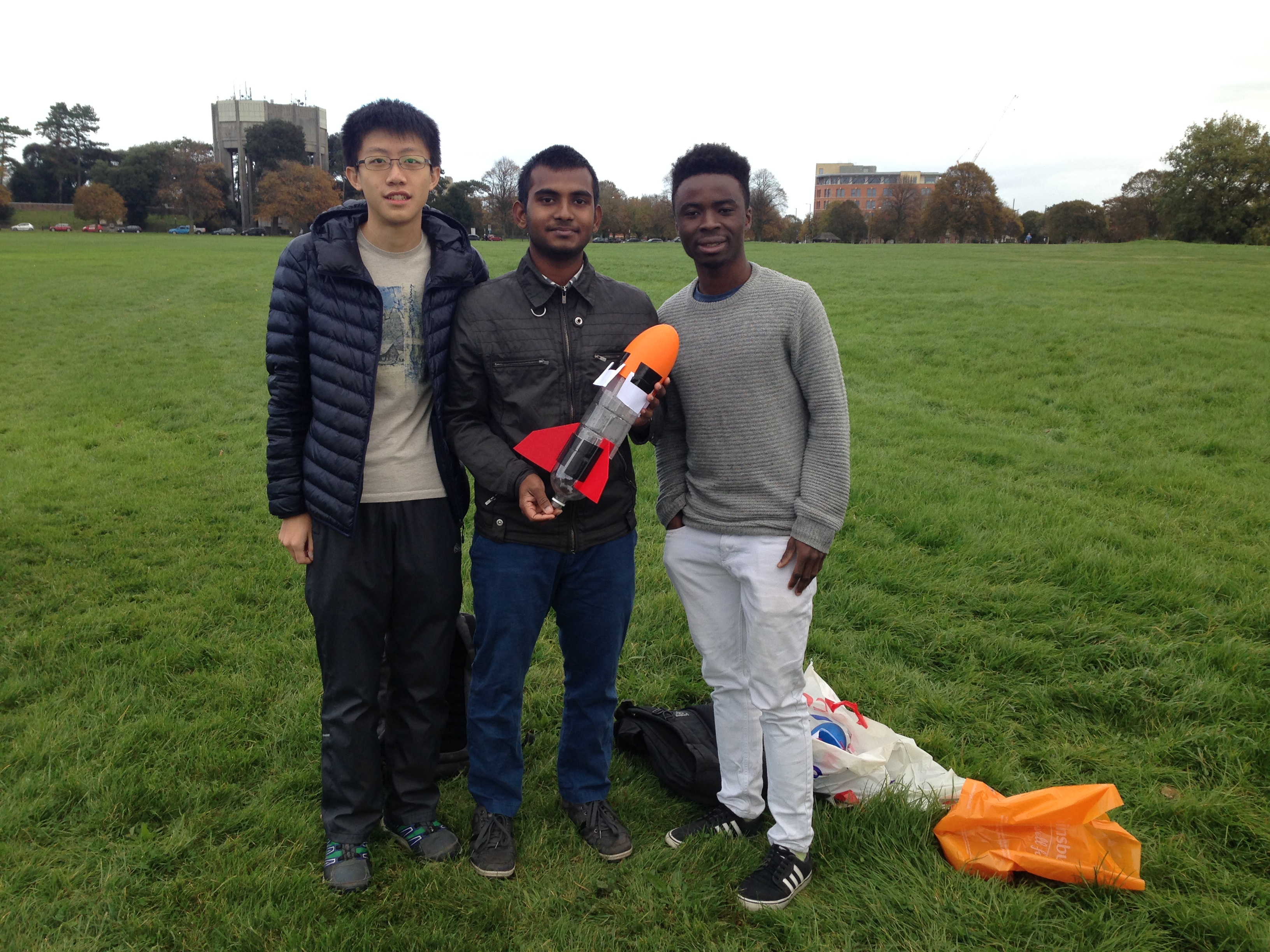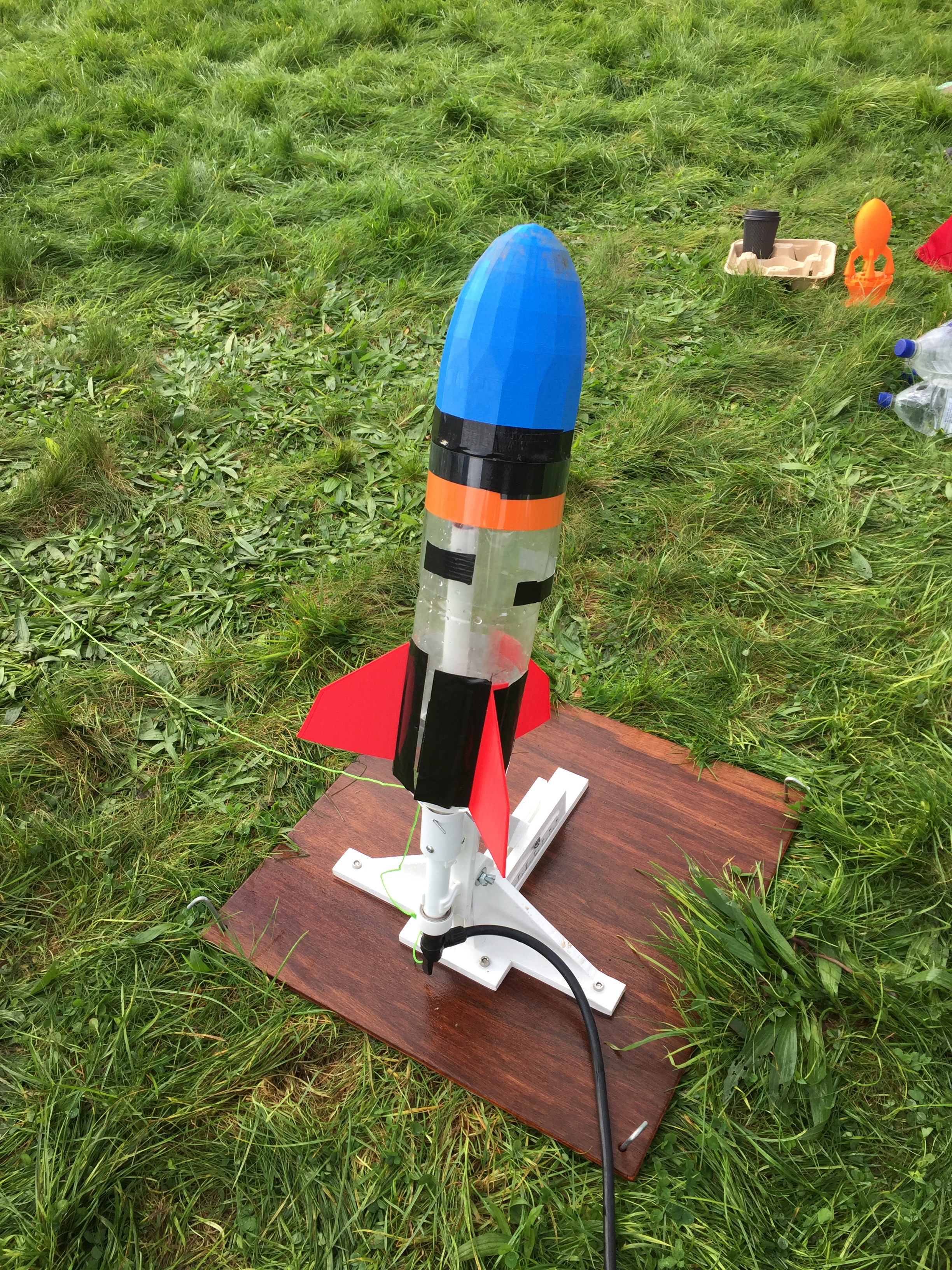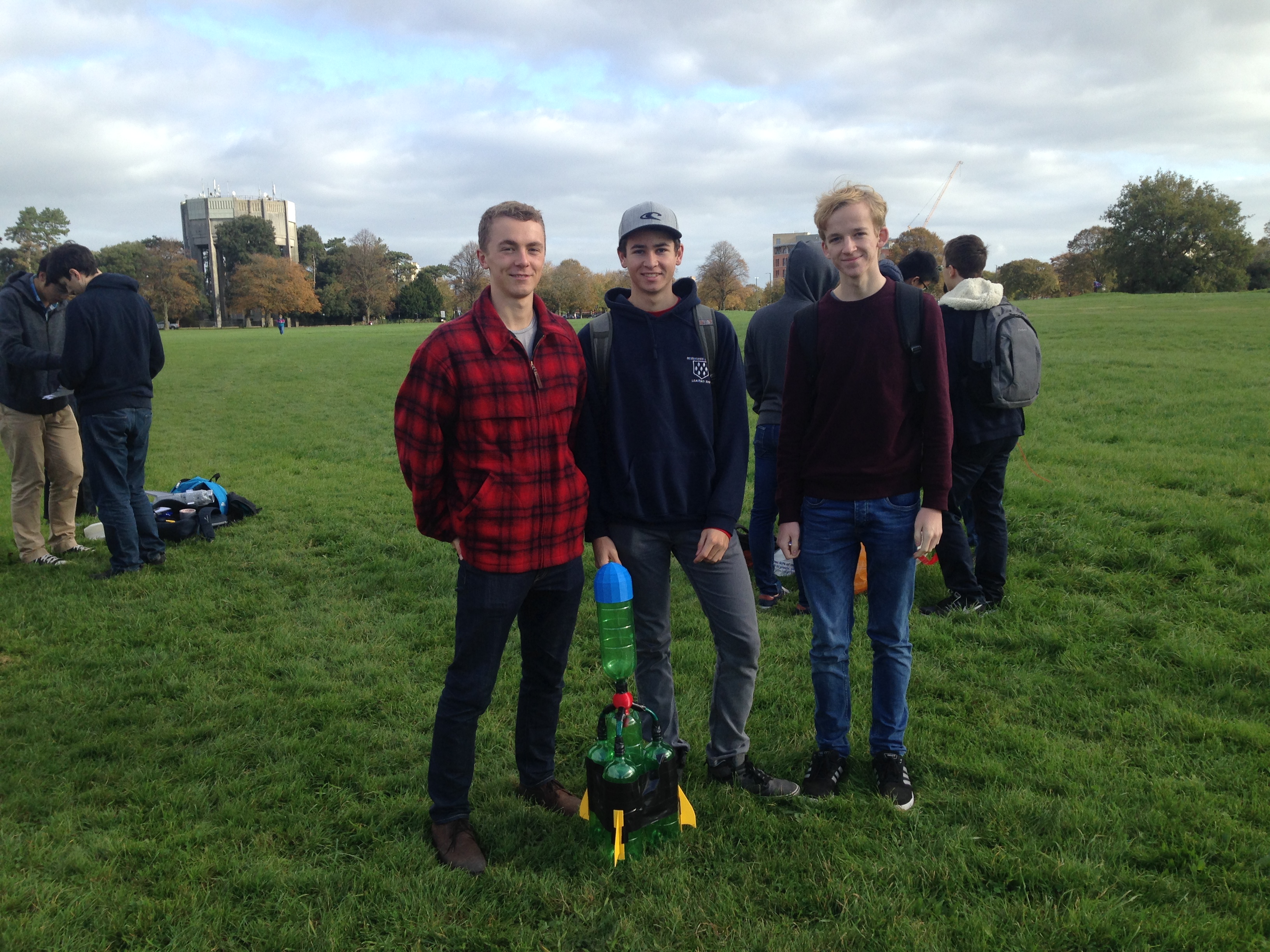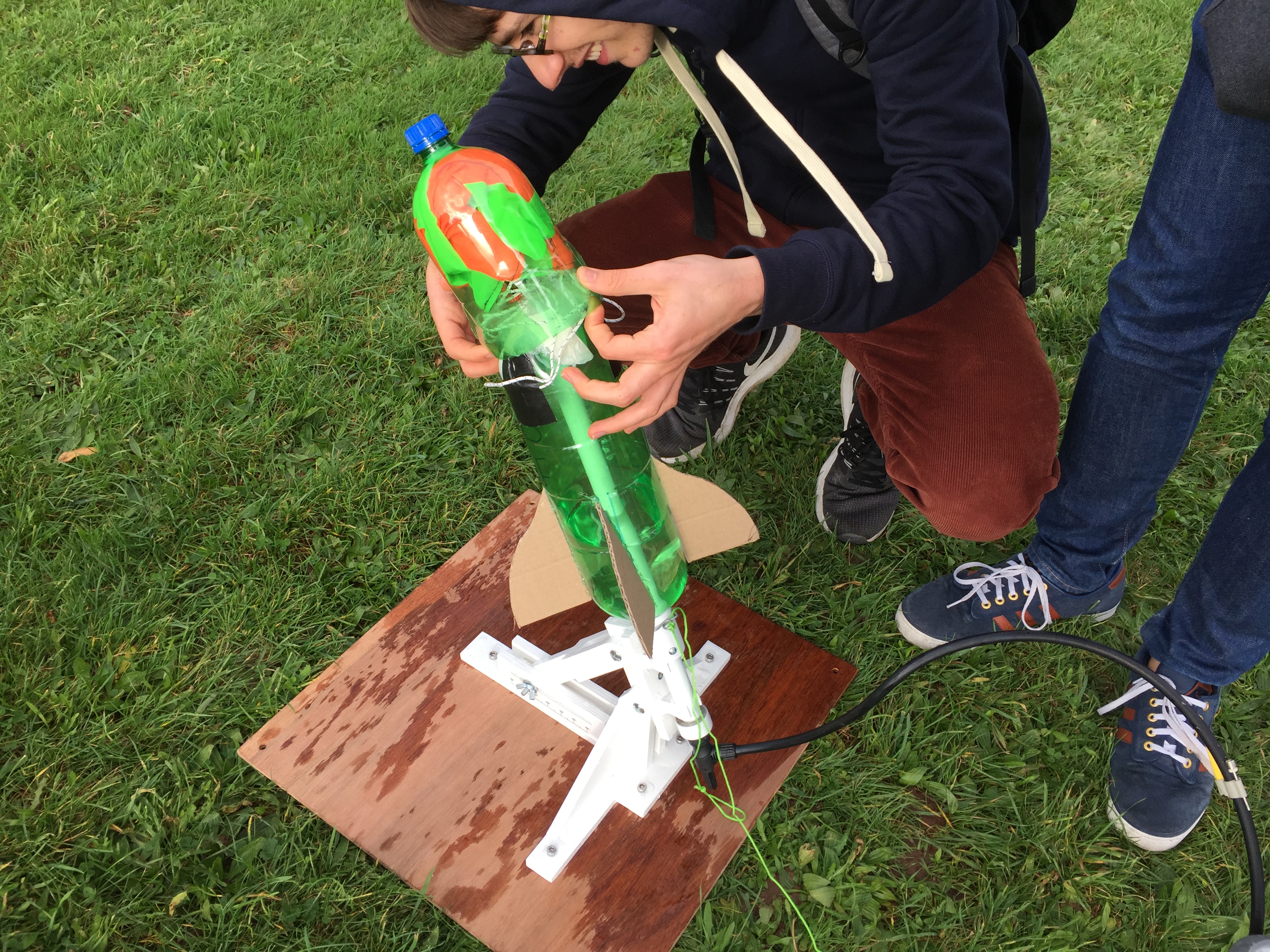 Our competitors were given four weeks to build their rockets from the kick off meeting to final launch day, with a test launch day a week before the end of the competition. In the intervening time the teams had to select their pressure vessel (2L lemonade bottle), choose their stabilisation fins (cardboard triangles), and design a nose cone (cardboard cone taped to the bottle). Teams showed an enormous amount of ingenuity, going well beyond this base standard with some groups using 3D printers to manufacture their nose cones and fins, others modifying the standard 2L bottles to increase their capacity and still others experimenting with alternate propellants; using carbonated drinks as propellant instead of tap water.